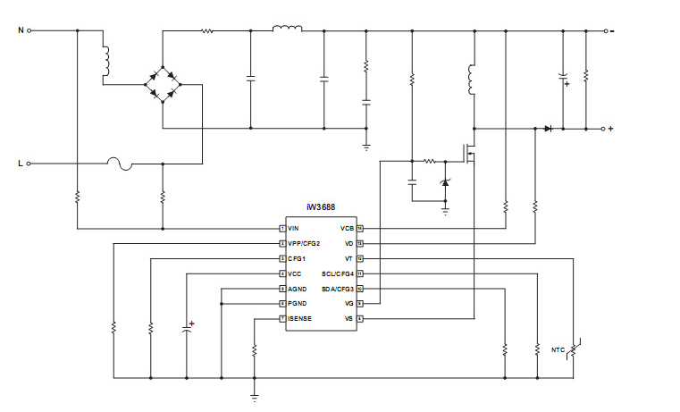 IW3688支持Buck-Boost(非隔离方案)或flyback拓扑结构(隔离方案),支持无调光器,前切,后切调光器,无调光器时高功率因数(PF>0.9)以及低THD<20%,大多数调光器可支持1%到100%的宽调光范围。无需专门的bleeder或启动电路,也无需辅助绕组,很简化的外围电路,只需要一个高压功率MOSFET,可使用非常廉价的单绕组电感。