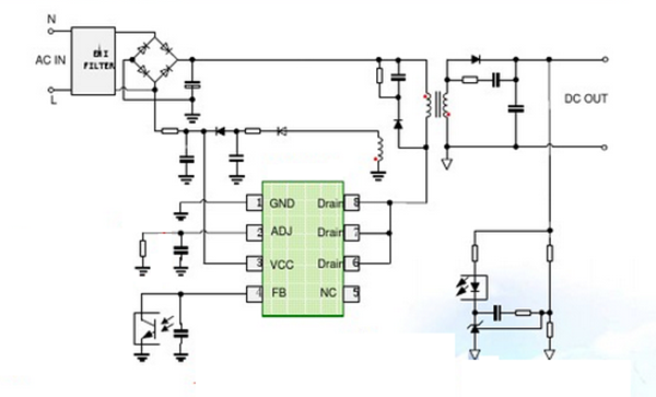内置峰值电流补偿电路,可以使不同交流电压输入时极限峰值电流一致。还可以通过调节端电阻调节极限输出功率。上电时,峰值电流补偿最大,然后逐渐达到平衡,可以减小在上电过程中变压器的应力,防止变压器饱和。 电路内部集成了各种异常状态保护功能。包括欠压锁定,过压保护,过载保护,脉冲前沿消隐,原线圈过流保护和温度保护功能。在电路发生保护以后,电路可以不断自动重启,直到系统正常为止。