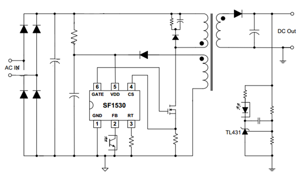 SF1530是一个中等功率的高性能绿色PWM控制器系列。适用于10W到40W适配器场合。该芯片频率可外部编程,带来系统设计的灵活性可获得更大的输出功率。SF1530在效率平坦性、OCP曲线平坦性方面做了精心的优化。同时还引入“零OCP恢复间隙控制”避免低压启动失败。该芯片集成了诸多保护功能,比如:VDD欠压保护(UVLO),VDD过压保护,软启动,逐周期过流保护,所有管脚浮空保护,GATE输出电压钳位保护,VDD电压钳位保护,等等。SF1530提供小体积的SOT-23-6和DIP-8封装。