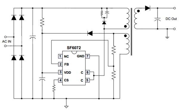 SF6072内置功率三极管,非常适合低成本小功率充电器、适配器和LED照明场合。 该IC采用专利的“NC-Cap/PSRTM”控制,无需任何外部电容,可实现小于±5%的恒 压恒流精度。该系列采用专利的“多模式PSR”控制,提高了可靠性和效率。