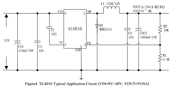 XL4016是一款高效, PWM 降压型DC-DC转换换器固定180KHz开关频率,可提供高达8A输出电流能力。XL4016具有低纹波,出色的线性调整率和负载调整率。只有少量的外围元件内置了频率补偿电路和固定频率振荡器,简化了电路设计。