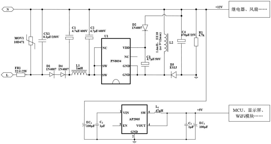 在家电应用中,市电通过非隔离开关电源PN8034转化为直流12V输出给继电器、风扇等负载,同时由AP2905将12V降压到5V作为MCU、显示屏、WiFi模块供电。
