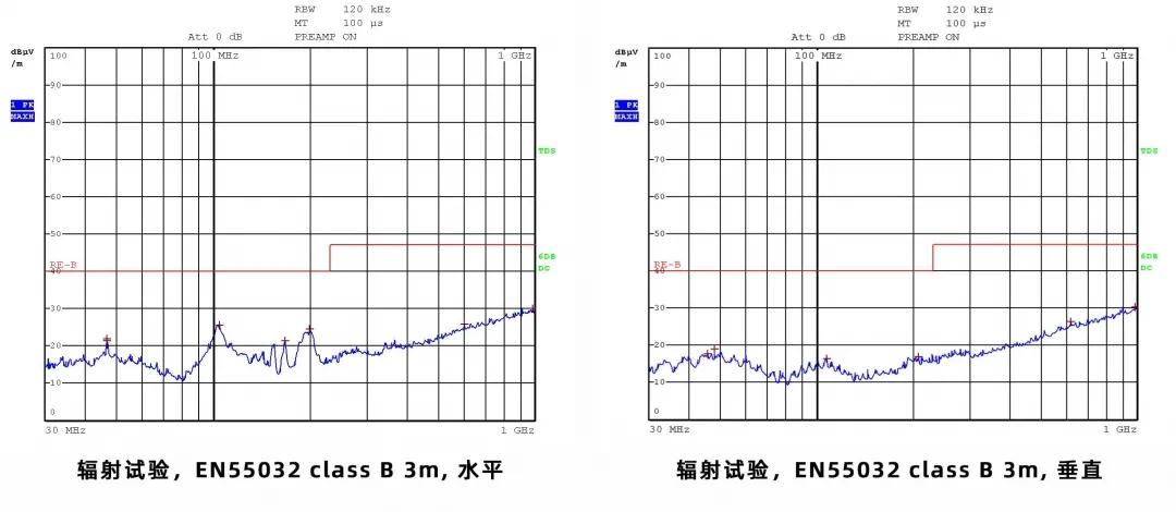 EMC测试:EMI辐射满足EN55032 Class B标准要求,裕量大于15dB。