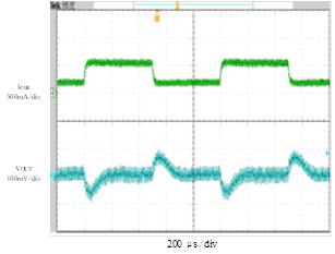 测试条件:Vin=12V, Vout=5V, Iout=0.175A~0.525A;测试结果:动态响应Vpp =180mV;