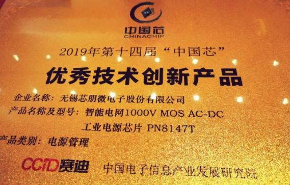 2019年10月25日第十四届“中国芯”集成电路产业促进大会在青岛举行,芯朋微电子PN8147T【智能电网1000V MOS AC-DC工业电源芯片】荣获“优秀技术创新产品奖”!是本次【中国芯】在电源管理领域评比大奖中仅有的2颗获奖芯片之一。