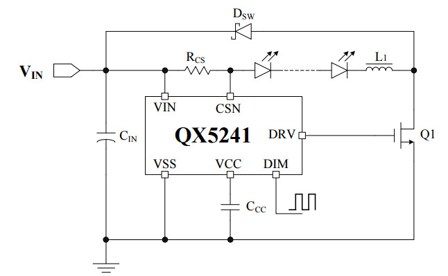 QX5241是通过外接一个电阻设定输出电流,最大可达3A,通过DIM引脚实现辉度控制功能。并采用泉芯特有的专利结构,在宽输入电压范围下,保证电流检测达到±5%的电流精度,由于采用滞环控制方式,QX5241对负载瞬变具有非常快的响应速度,对输入电压具有高的抑制比,最高工作频率可到2MHz,工作温度范围从-40℃到125℃.